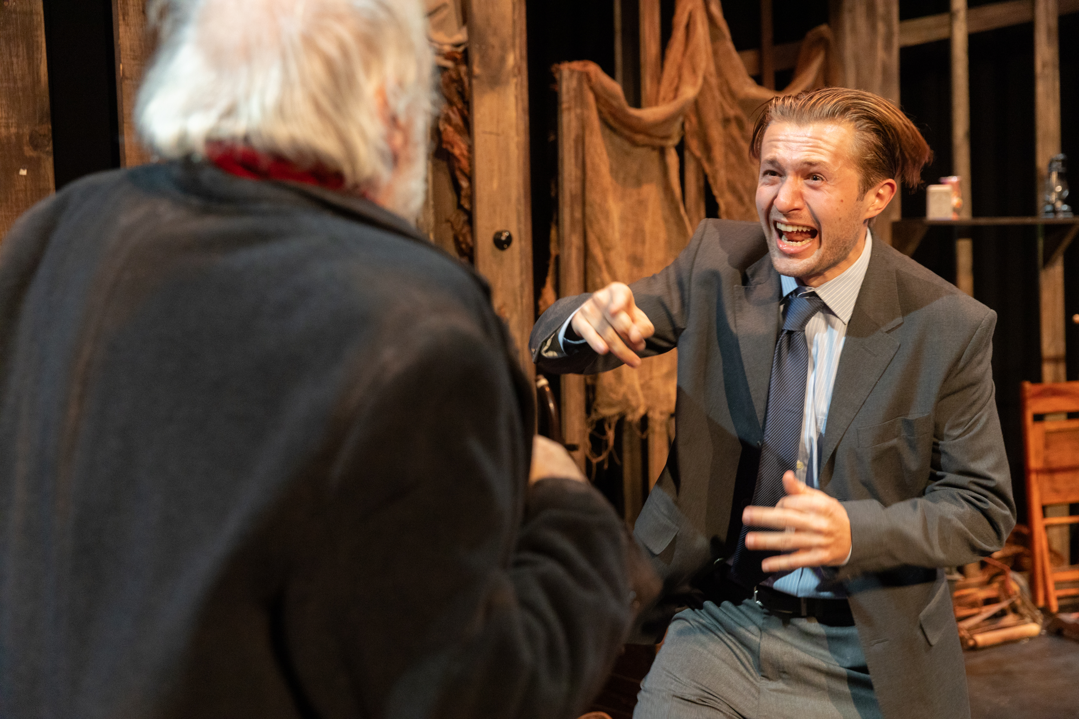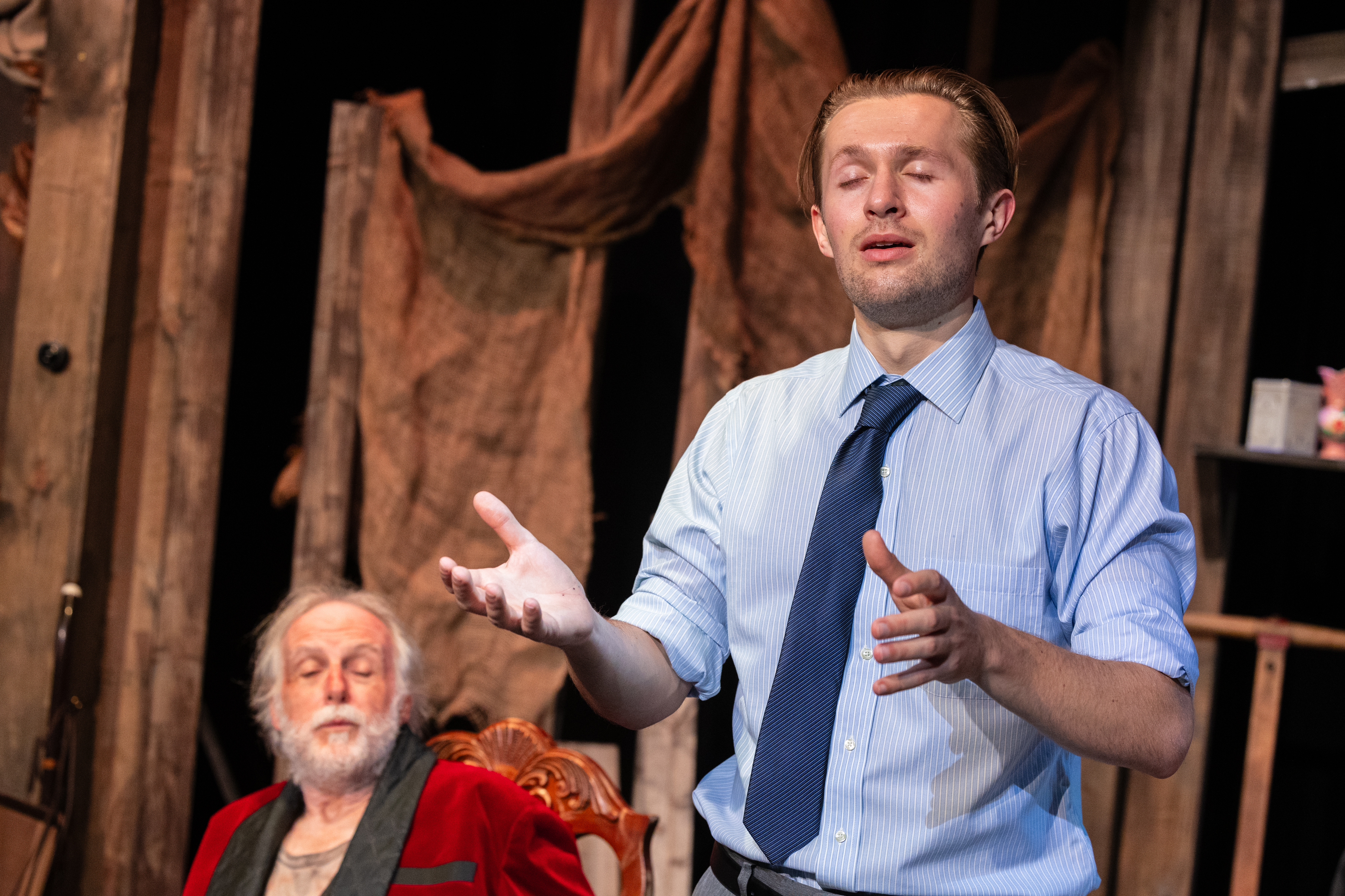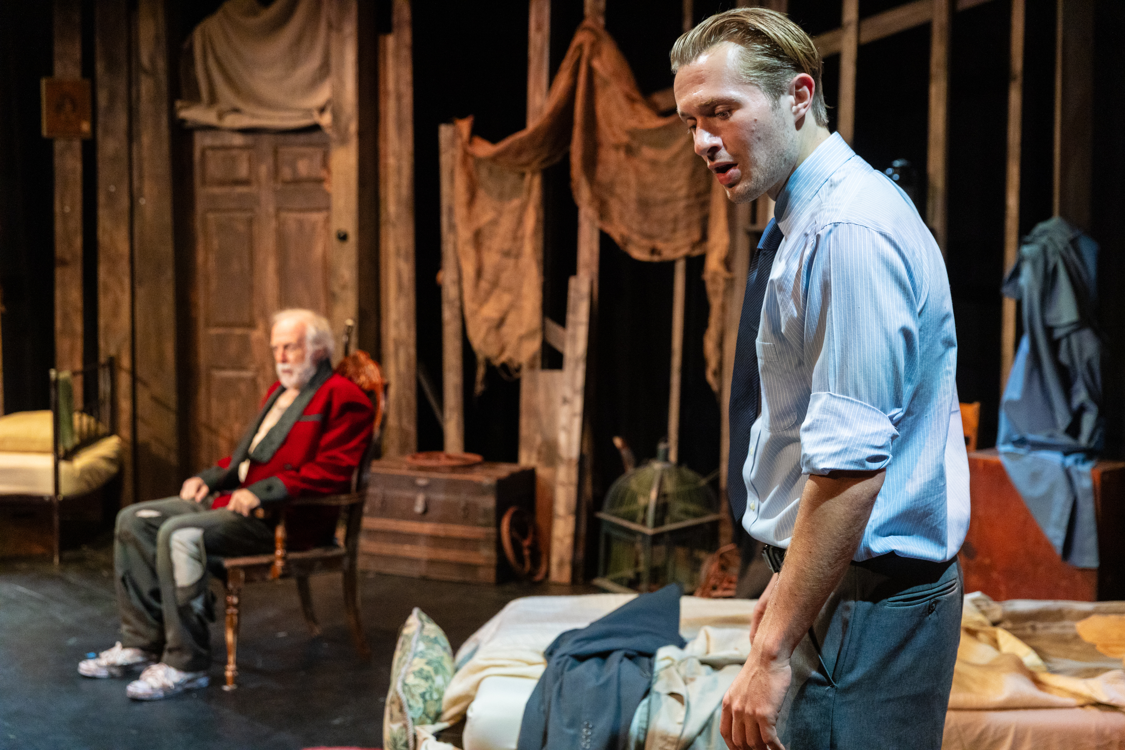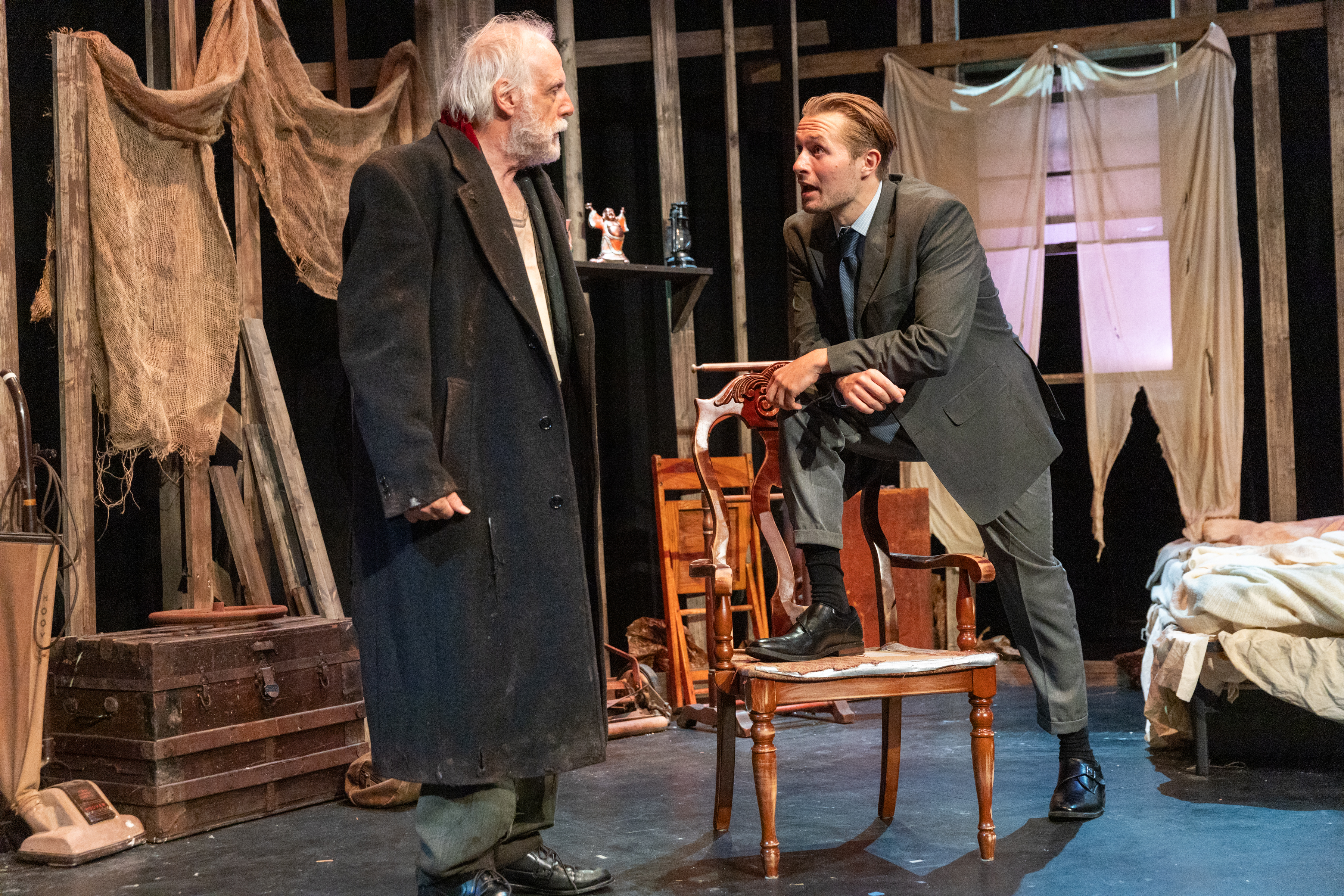 “…younger brother Mick played with slick ease by Max Johnson pops in. Mick is the live wire, dangling bits of sanity, periodically making sense, then tumbling into a morass of gibberish himself…. Mick slithers and slides onto the scenes, even points with his leg and foot while reclining. He confidently weaves a fantasy world for Davies.” DC Theater Arts